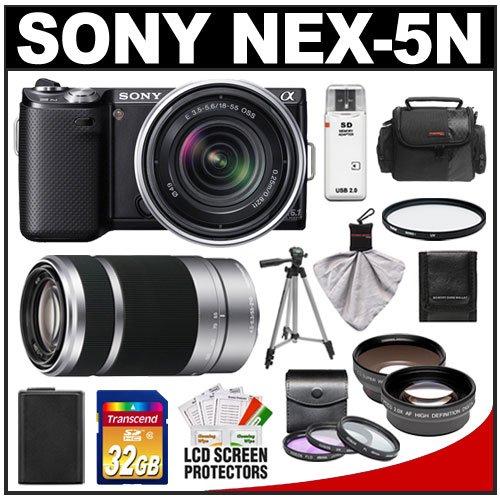 Buy Sony Alpha NEX-5N Digital Camera Body E 18-55mm OSS Lens (Black) with E 55-210mm Lens + 32GB Card + Battery + 4 Filters + Telephoto, Wide-Angle Lenses + Case + Tripod + Accessory Kit Prices